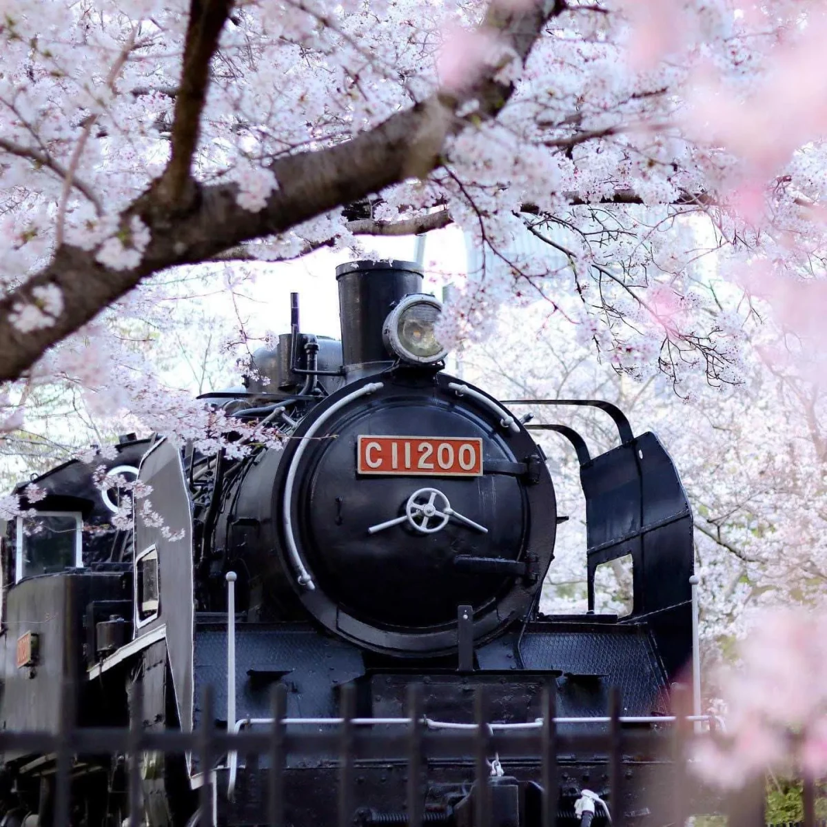 中川原公園の蒸気機関車C11 200号機と満開のさくら